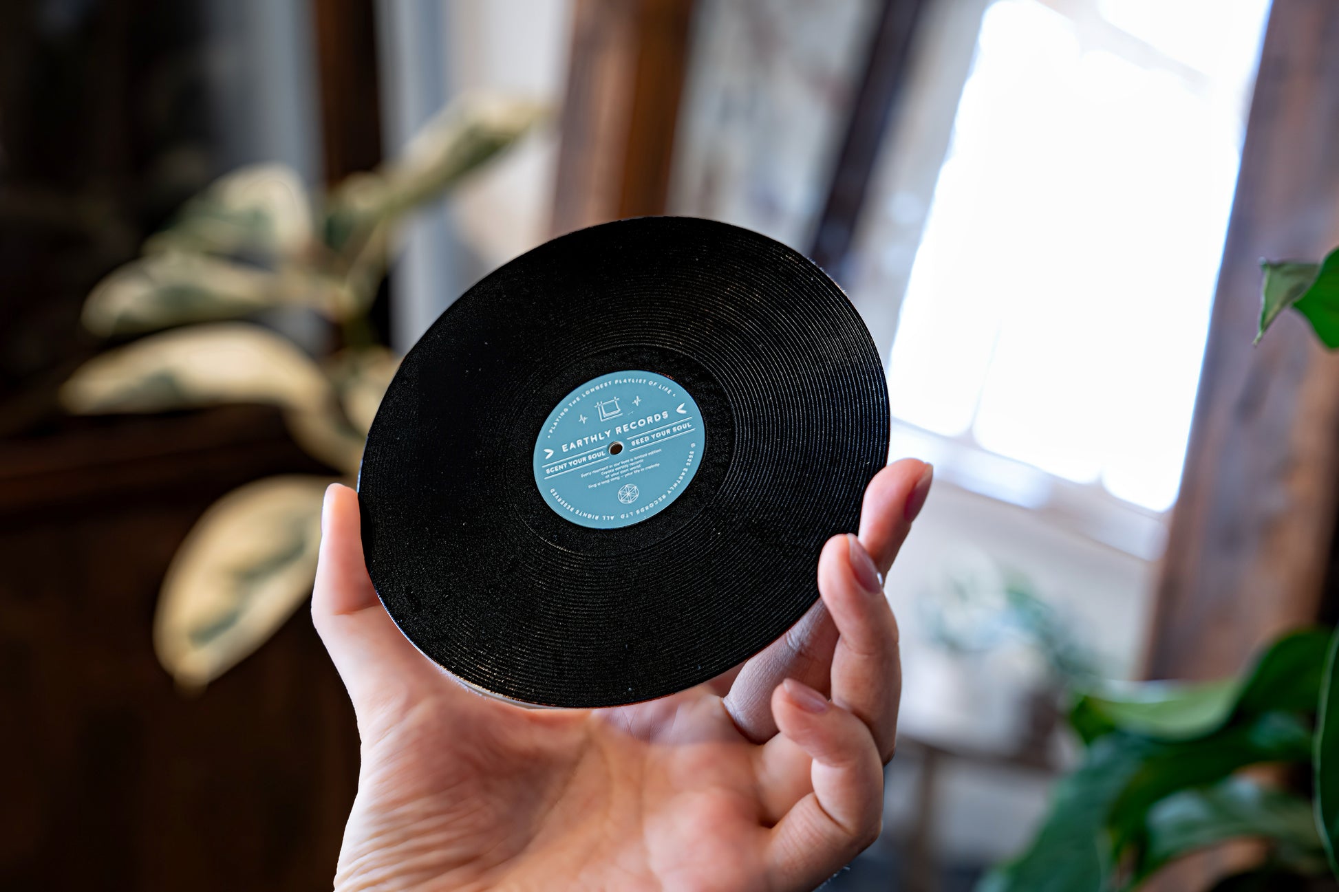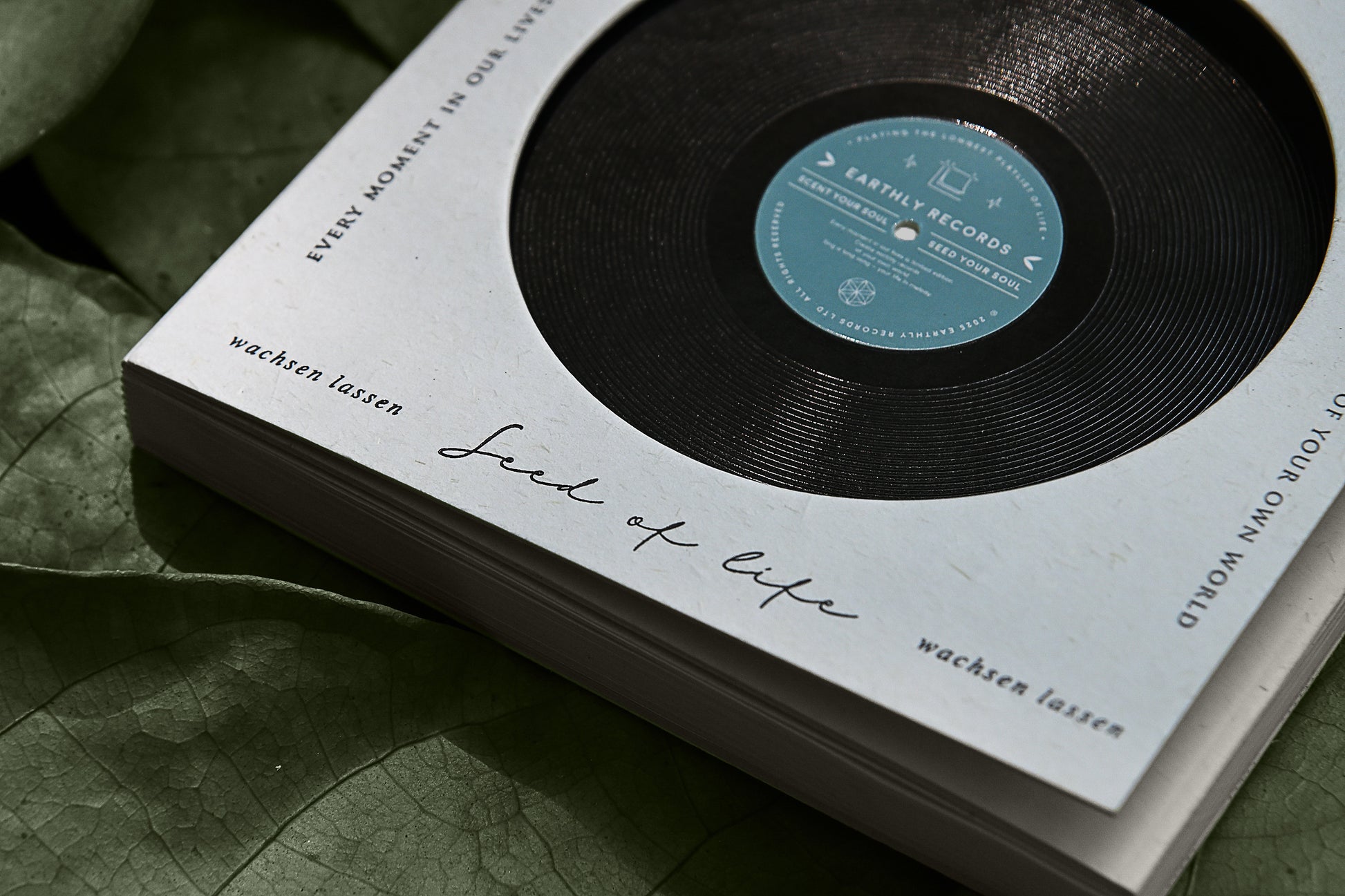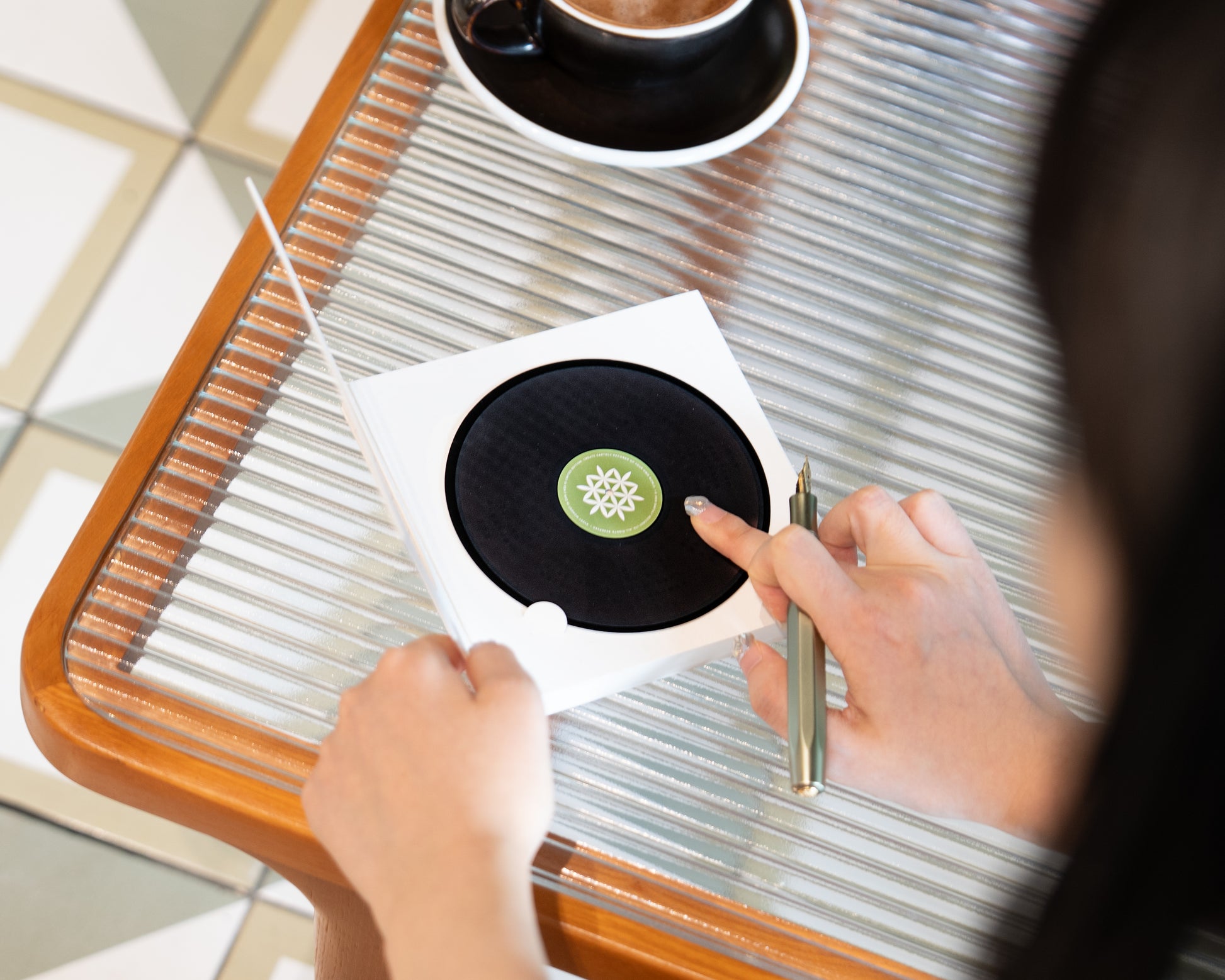 《人生唱片》手帳的感溫紙黑膠唱片卡,內置NFC感應,使用手機輕觸唱片卡中央,即可快速自動連接到Earthly Records專輯音樂歌單。